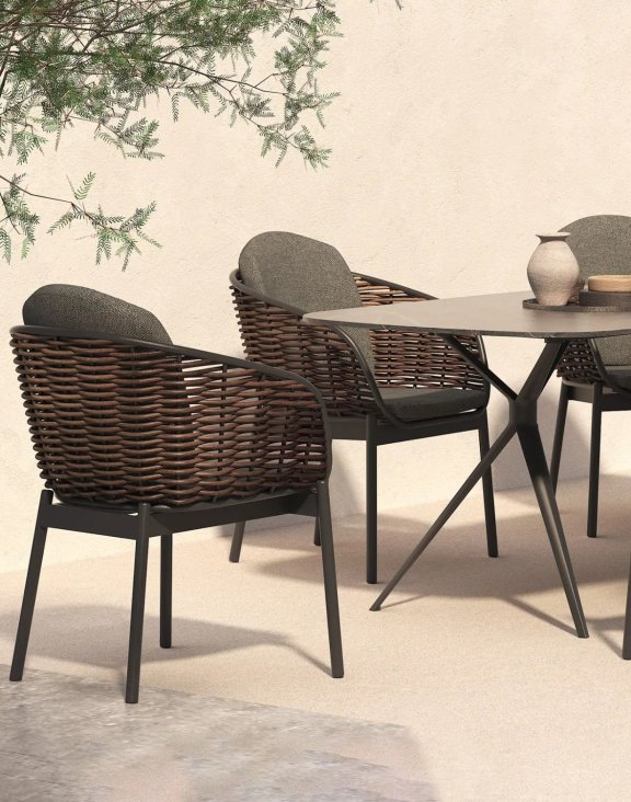 Židle jsou vyrobeny ze speciálního výpletu imitujícího přírodní proutí v ořechové barvě, vyzařuje nejen eleganci, ale poskytuje také pohodlí.