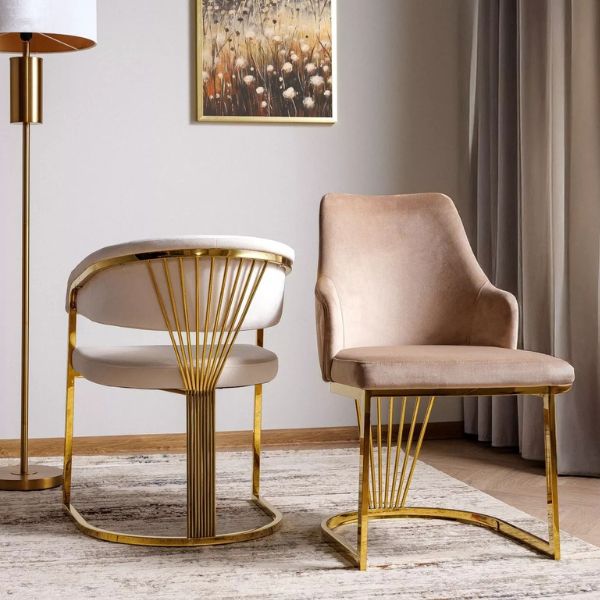 Moderní židle čalouněná měkkou sametovou látkou Bluvel 28 v elegantním světle béžovém odstínu, umístěná na ušlechtilé konstrukci z nerezové oceli ve zlatém provedení.
