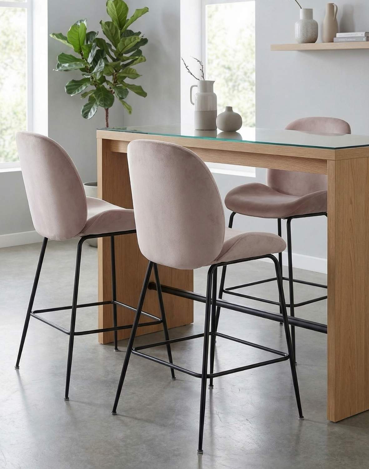Barová židle Dori Black značky Avida Design v béžové barvě se zaobleným opěradlem a sedákem je dokonalým doplňkem do kuchyně, jídelny s vysokým pultem nebo domácího baru.