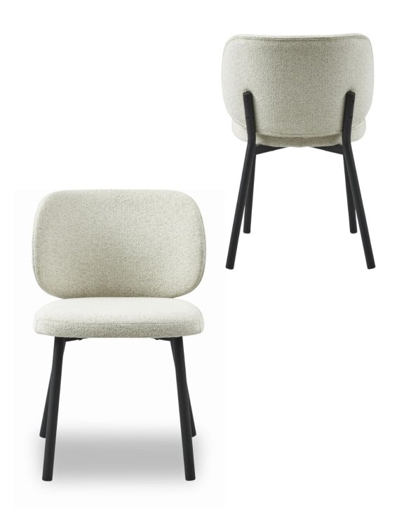 Tkanina bouclé použitá v tomto modelu se vyznačuje krátkými, měkkými smyčkami, které dodávají židli útulný charakter a texturovanou hloubku.