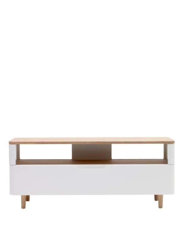 Bílá TV skříňka Amalfi značky Unique je harmonickým spojením moderního designu s klasickou skandinávskou estetikou.