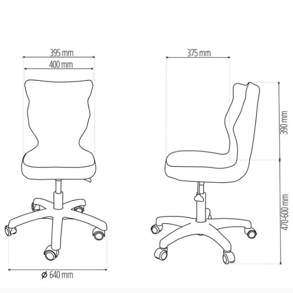 Rozměry: šířka opěradla 395 mm, šířka sedáku 400 mm, průměr základny 450 mm, hloubka sedáku 375 mm, výška opěradla 390 mm, nastavení výšky židle v rozmezí 470–600 mm.