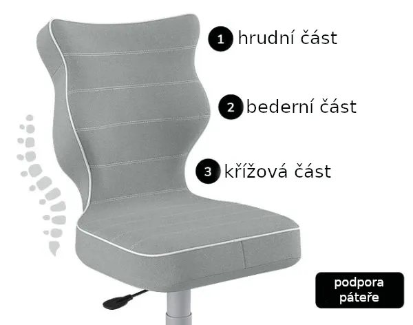 Židle byla navržena tak, aby podporovala správné držení páteře – profilované opěradlo a sedák odlehčují hrudní, bederní i křížovou část zad, což pomáhá předcházet bolestem zad i při delším sezení u psacího stolu.