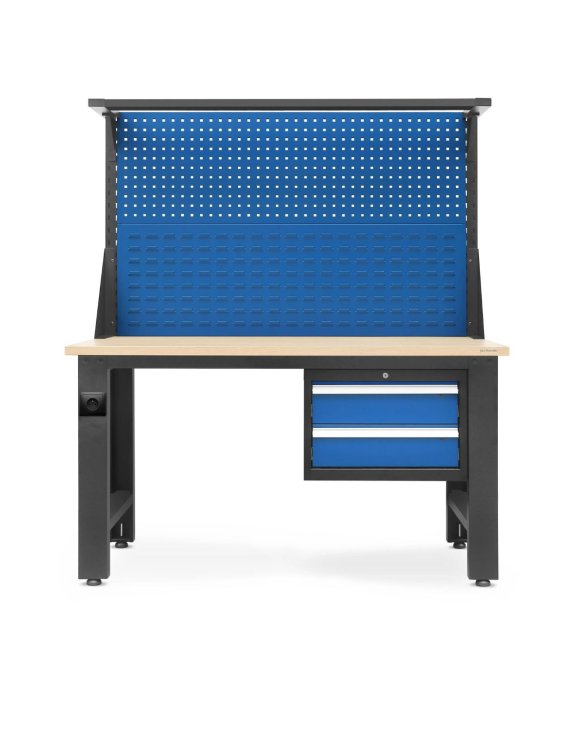 Dílenský stůl je vybaven zásuvkami zamykatelnými na klíč, nástěnným panelem na nářadí, držákem na lampu a zásuvkou.