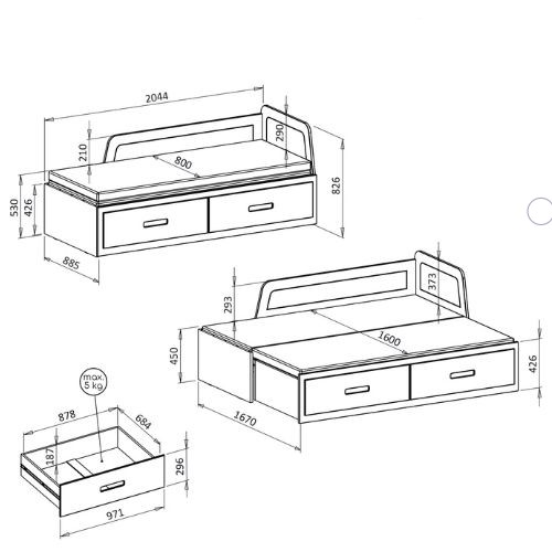 Plocha na spaní je 80x200 cm s možností rozšíření na 160x200 cm.