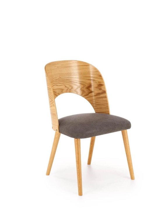 Čalounění v popelavé barvě, umístěné pouze na sedáku, dodává židli eleganci a jemnost.