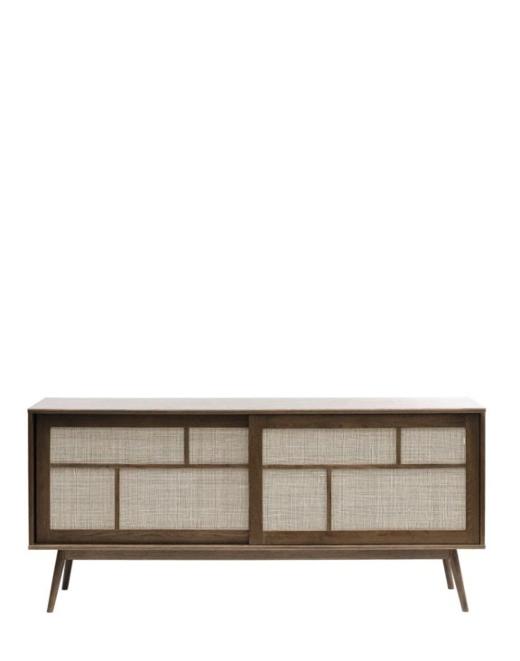 Dvířka z přírodního dubu a ratanu vnášejí do interiéru teplo a organický prvek a zároveň dodávají komodě lehce rustikální, ale stále moderní vzhled.