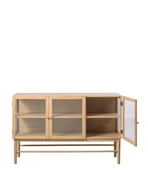 Dřevěné prvky dodávají nábytku teplý a přírodní charakter, zatímco prosklené části umožňují efektní vystavení uložených předmětů.