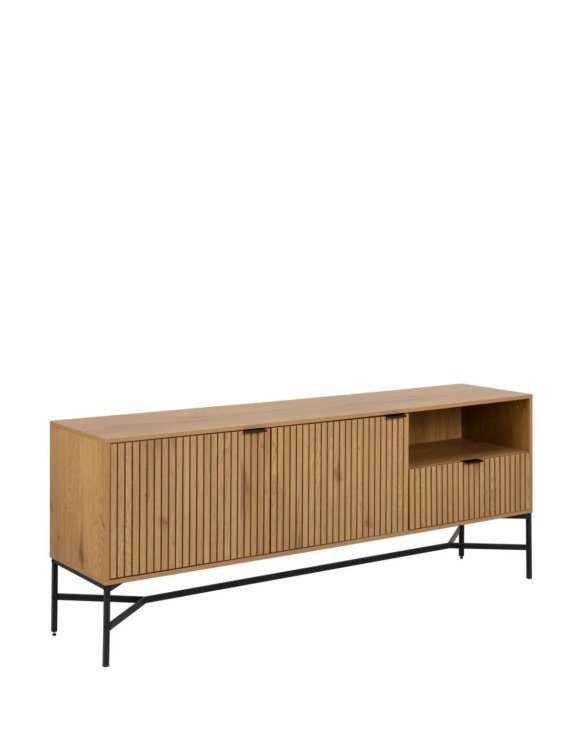 Konstrukce komody je vyrobena z odolného, černého kovu, který působí kontrastně k barvě dřeva a zároveň je velmi moderní.