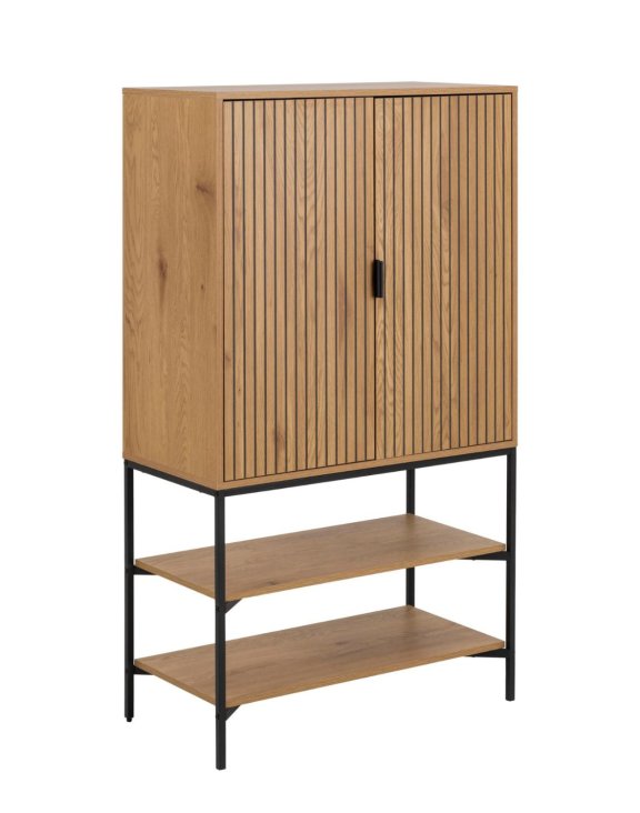 Její přední dvířka jsou ozdobena efektními lamelami se strukturou dřeva, které dodávají nábytku jedinečný charakter a výrazný vzhled.