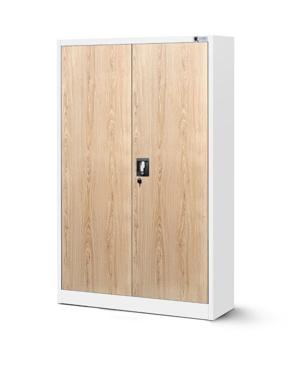 Kancelářská kovová skříň Kevin značky Jan Nowak v bílé barvě kombinované s barvou dub sonoma dodá prostoru jedinečný charakter a bude nepostradatelným nábytkem v kancelářských prostorech.