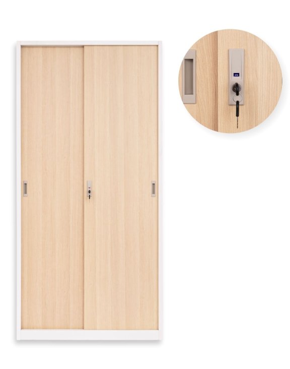 Skříň s posuvnými dveřmi uzamykatelnými na klíč umožňuje úsporu místa, což z ní činí ideální volbu pro prostory s omezenou plochou.