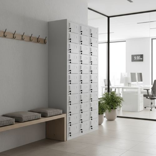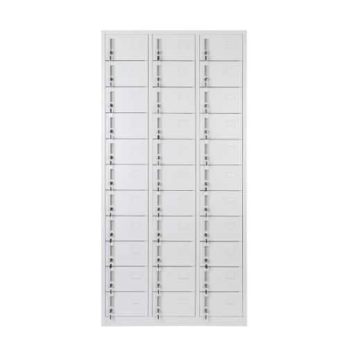Kancelářská kovová skříň s uzamykatelnými přihrádkami Osaka v šedé barvě je ideálním modelem pro ukládání osobních věcí zaměstnanců v odpočinkových místnostech, šatnách nebo kancelářích.