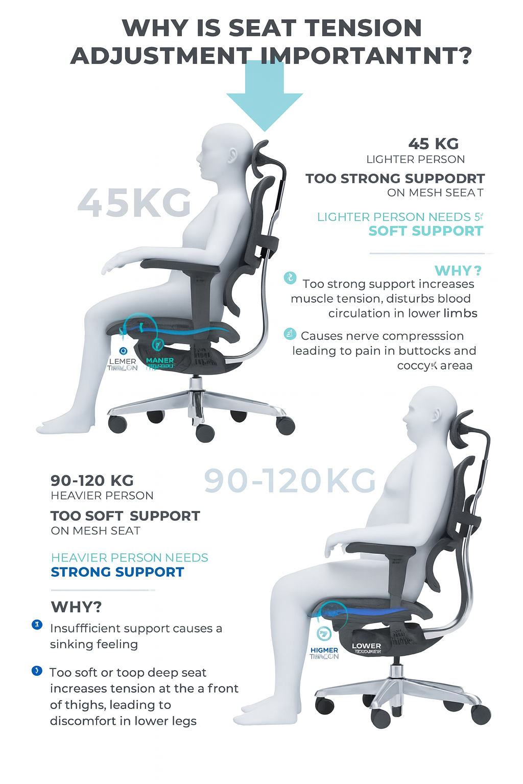 Nová verze židle Ergohuman 2 Elite ST má nastavení napětí síťoviny sedáku, které se provádí samostatným otočným ovladačem.