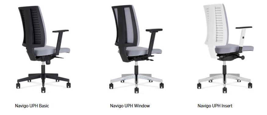 Série Navigo nabízí tři typy opěradel. Tento model je vybaven verzí UPH – čalouněné opěradlo s nastavitelnou výškou.