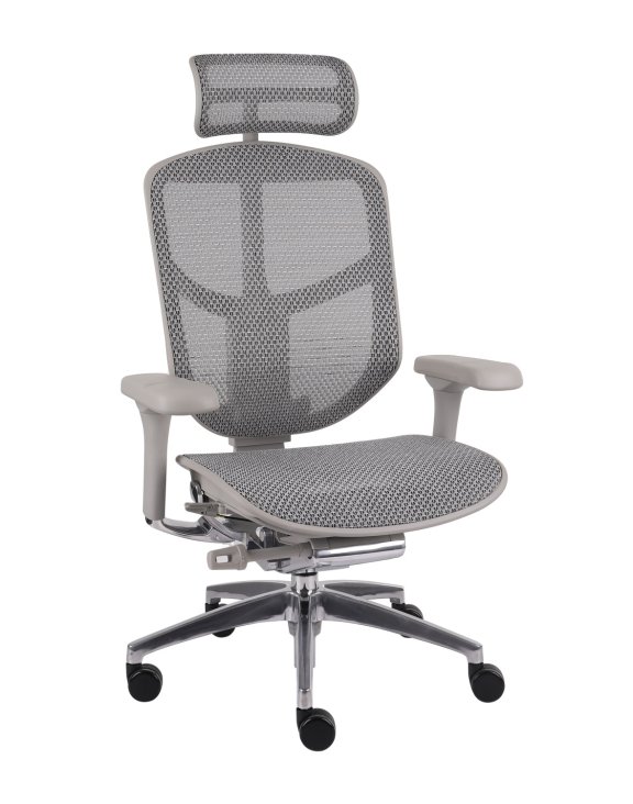 Opěrka hlavy, opěrák a sedák jsou čalouněny inovativní šedou síťovinou.