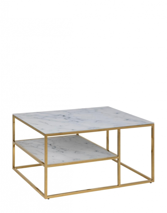 Stůl je vybaven čtvercovou poličkou, jejíž horní část je opakujícím se mramorovým vzorem.
