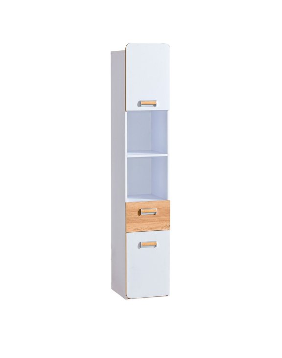 Vysoká a úzká konstrukce knihovny umožňuje maximální využití prostoru i v menších místnostech. Za plnými dvířky se nacházejí praktické police, které jsou ideální pro ukládání poskládaného oblečení, ručníků, ložního prádla, knih, nebo jiných domácích doplňků.