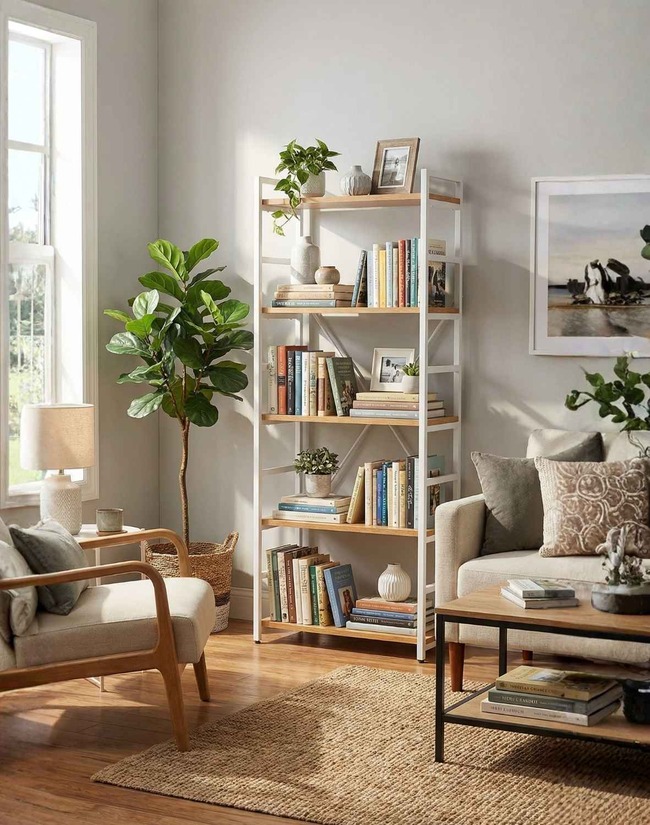Nábytek má 5 prostorných polic, na které můžete umístit knihy nebo fotografie a bílý rám, který knihovně dodává moderní vzhled.