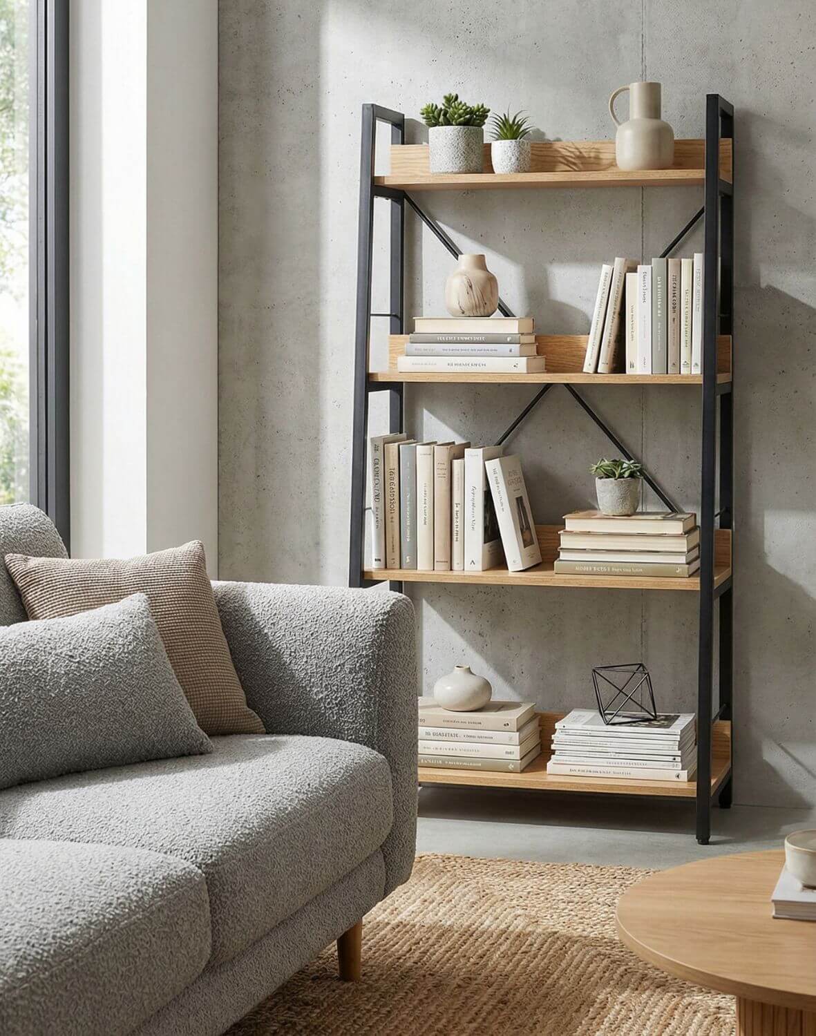 Čtyři police různých šířek jsou upevněny na dvou kovových, mírně se svažujících regálech - musíme přiznat, že knihovna Modern S24 je poutavá a funkční.