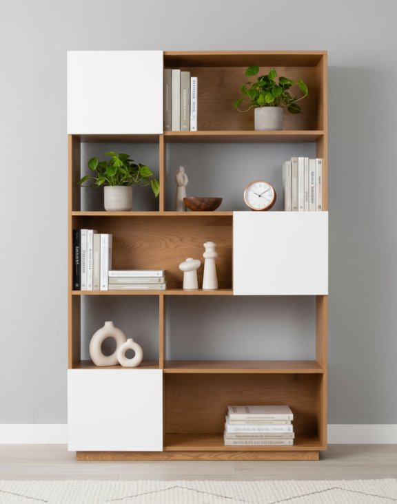 Knihovna Nevada 110 cm značky Avida Design je moderní kus nábytku, který spojuje teplo přírodního dubu s čistotou bílé – ideální volba do světlých, minimalistických interiérů.