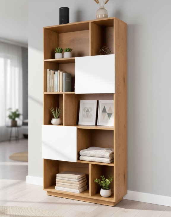 Knihovna Nevada 80 cm značky Avida Design je moderní kus nábytku, který spojuje teplo přírodního dubu s čistotou bílé – ideální volba do světlých, minimalistických interiérů.
