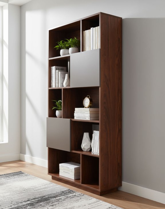 Její konstrukce umožňuje praktické uložení věcí: otevřené police jsou ideální na knihy, rostliny či dekorace, zatímco uzavřená část za dvířky je vhodná pro dokumenty, elektroniku nebo jiné předměty každodenní potřeby.