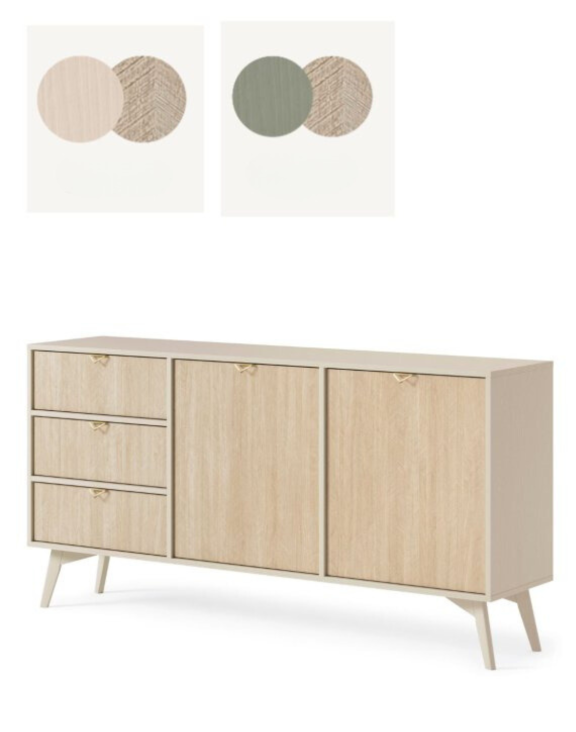 Komoda je dostupná ve dvou barvách: béžové a eukalyptové, což umožňuje její přizpůsobení různým interiérům a dodává jim jedinečný charakter a funkčnost.