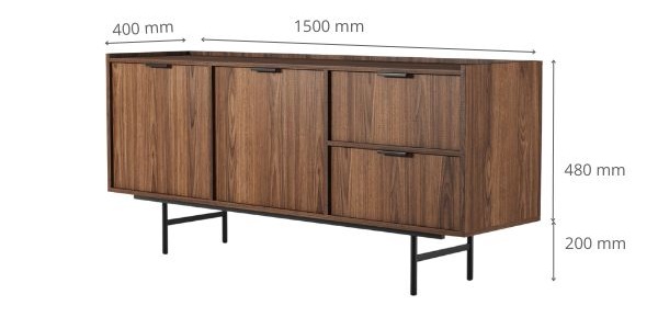Optimální rozměry – šířka 150 cm, výška 68 cm a hloubka 40 cm dělají z komody ideální řešení i pro menší prostory, aniž by ztratila na kapacitě.