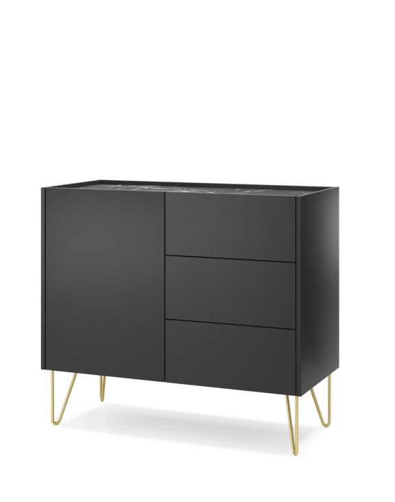 Její černá barva dodává interiéru hloubku a zdůrazňuje moderní styl. Vrchní deska napodobuje černobílý mramor, což komodě dodává jedinečný charakter.