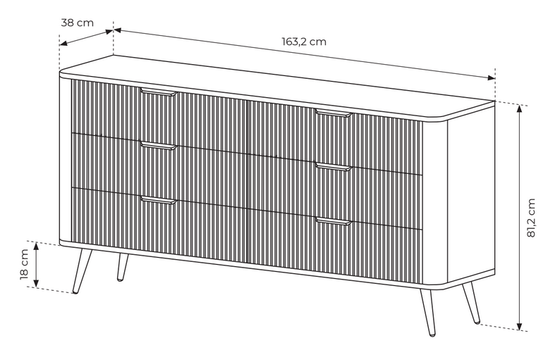Komoda Lante C v černém provedení spojuje moderní eleganci s praktickou funkčností. Rýhovaná MDF čela, štíhlé kovové nohy a promyšlené uspořádání se skříňkami a zásuvkami z ní dělají ideální doplněk do obývacího pokoje, jídelny i ložnice.