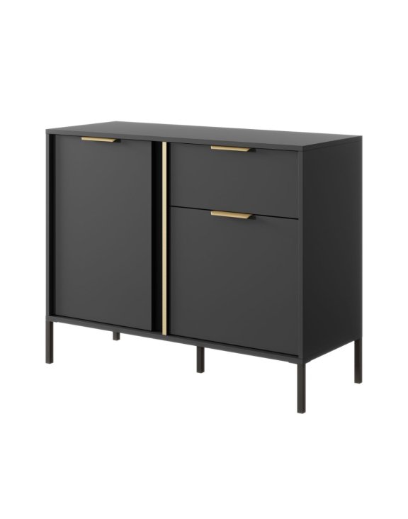 Komoda Lars B v antracitové barvě představuje stylové spojení moderního designu a zlatých detailů. Díky třem skříňkám a dvěma zásuvkám nabízí dostatek úložného prostoru a skvěle se hodí do moderního obývacího pokoje nebo jídelny.