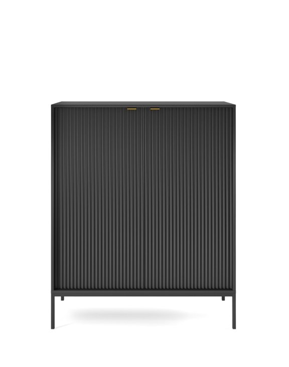 Přední část komody je vyrobena z ryhované MDF desky o tloušťce 18 mm, což jí dodává eleganci a styl. Okraje přední části jsou také zesíleny ABS plastem a hliníková úchytka dodává moderní vzhled. Nohy komody jsou podepřeny ocelovými rámy, které byly práškově lakovány, což zajišťuje jejich trvanlivost a stabilitu.