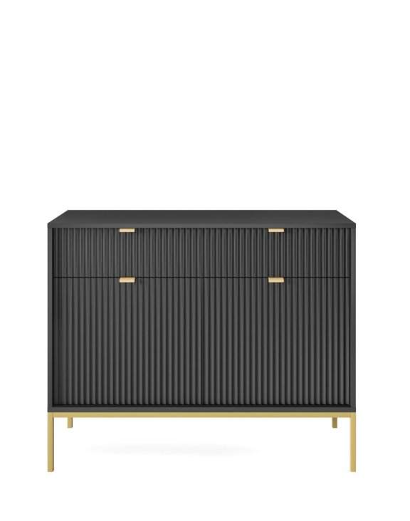 Přední část komody je vyrobena z ryhované MDF desky o tloušťce 18 mm, což jí dodává eleganci a styl. Okraje přední části jsou také zesíleny ABS plastem a hliníková úchytka dodává moderní vzhled. Nohy komody jsou podepřeny ocelovými rámy, které byly práškově lakovány, což zajišťuje jejich trvanlivost a stabilitu.