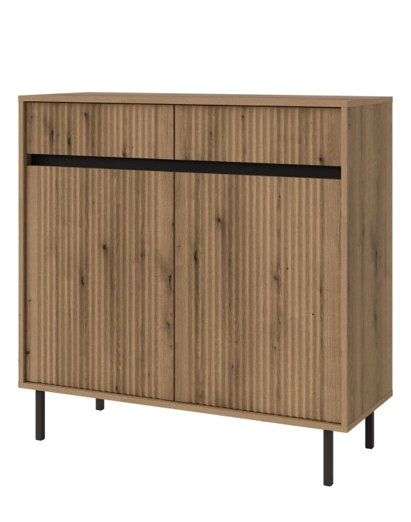 Díky dvěma prostorným zásuvkám a čtyřem velkým policím ukrytým za dvířky nabízí komoda ideální řešení pro přehledné ukládání věcí.
