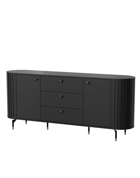 Drážkované boky komody, černá barva a jemné úchyty odpovídají aktuálním trendům.