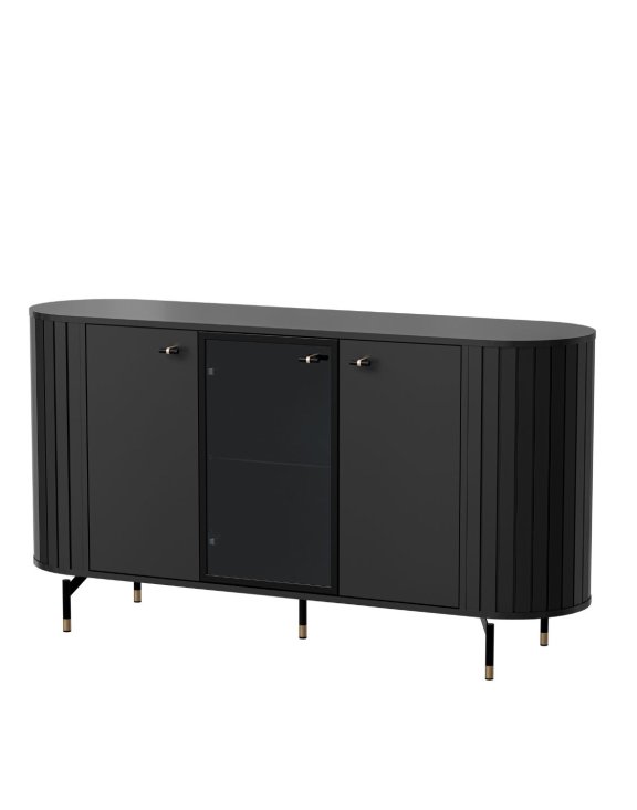 Drážkované boky komody, černá barva a jemné úchyty odpovídají aktuálním trendům.
