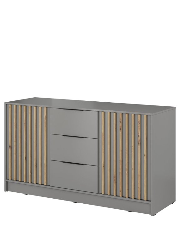 Charakteristickým prvkem komody jsou lamely v odstínu dub artisan umístěné na dveřích, které jí dodávají jedinečný styl a charakter.