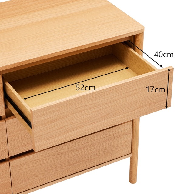 Vyrobena s důrazem na každý detail, komoda je potažena dubovou dýhou v odstínu přírodního dubu, což zvýrazňuje strukturu dřeva a dodává interiéru teplý, nadčasový charakter.