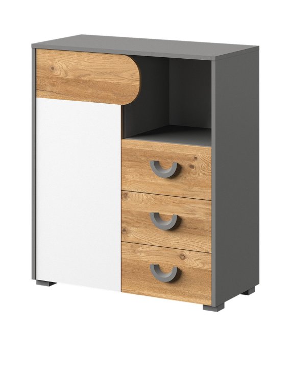 Komoda se zásuvkami a skříňkou z kolekce Carini je moderní volbou do pokoje teenagera.