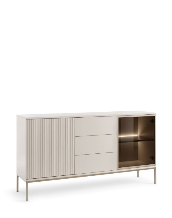 Komoda Sento (KSZ154) se zásuvkami značky Piaski s LED osvětlením v kašmírové barvě je elegantní a funkční kus nábytku, ideální pro moderní interiéry.