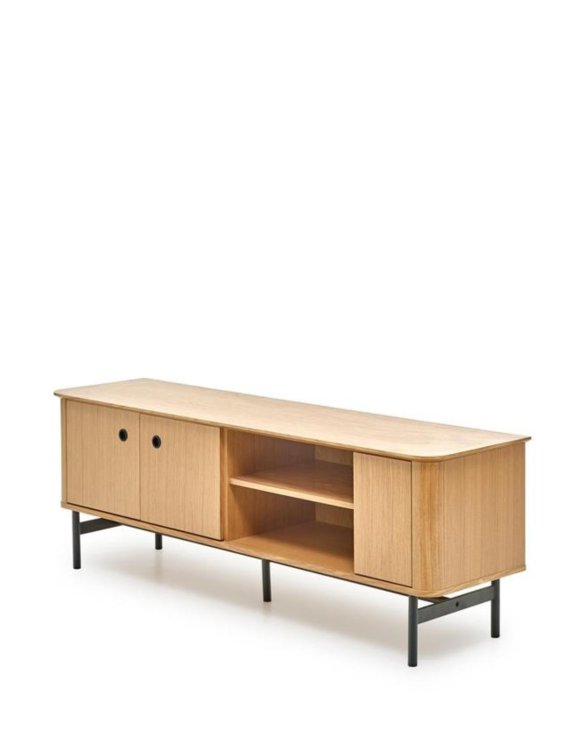 Teplý odstín přírodního dubu stylově kontrastuje s černými nohami a madly. Komoda skvěle zapadne jak do retro, tak i do moderních interiérů.