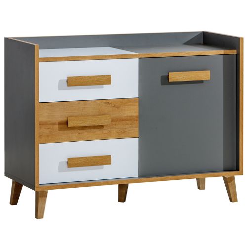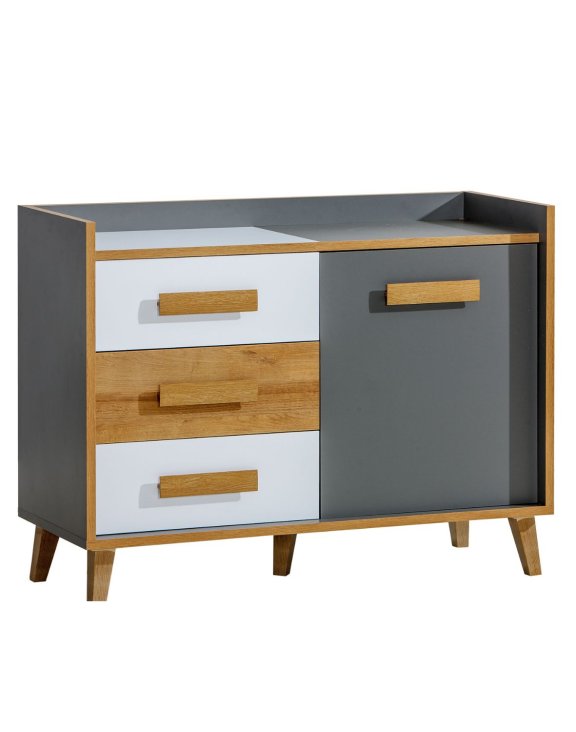 Komoda je vybavena třemi prostornými zásuvkami a jednou skříňkou s dvířky, díky čemuž nabízí dostatek místa pro uložení věcí. Vyrobena z kvalitní laminované desky, která zaručuje dlouhou životnost, a snadno udržovatelný povrch pomáhá zachovat její dokonalý vzhled po mnoho let.