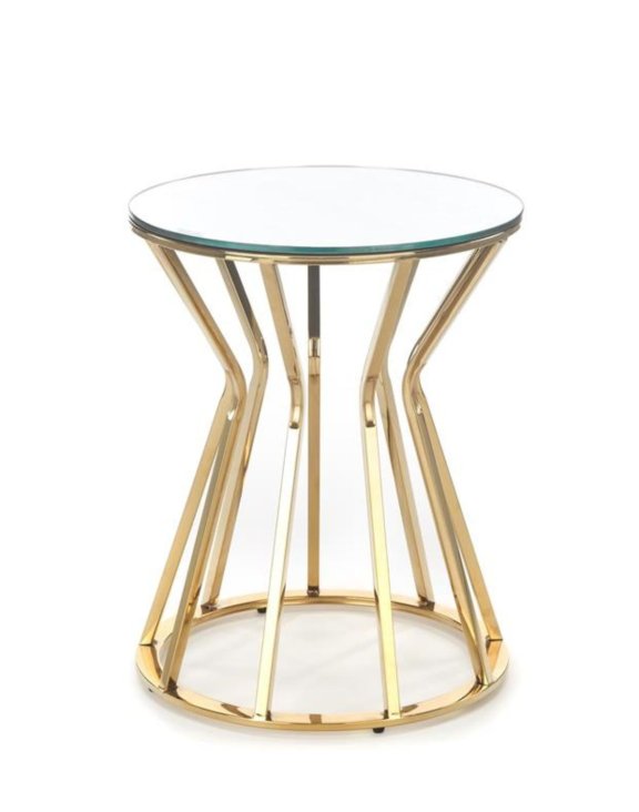 Má zlatý rám a skleněnou desku, díky čemuž se skvěle hodí do moderních a luxusních interiérů.