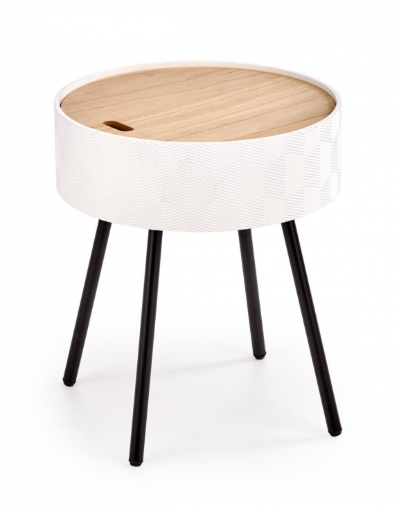 Poznávacím znamením stolu je odnímatelná horní deska, kterou lze použít jako podnos, a samotný nábytek přebírá také funkci úložného boxu na drobné předměty.