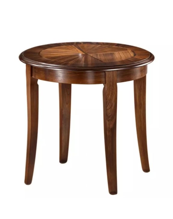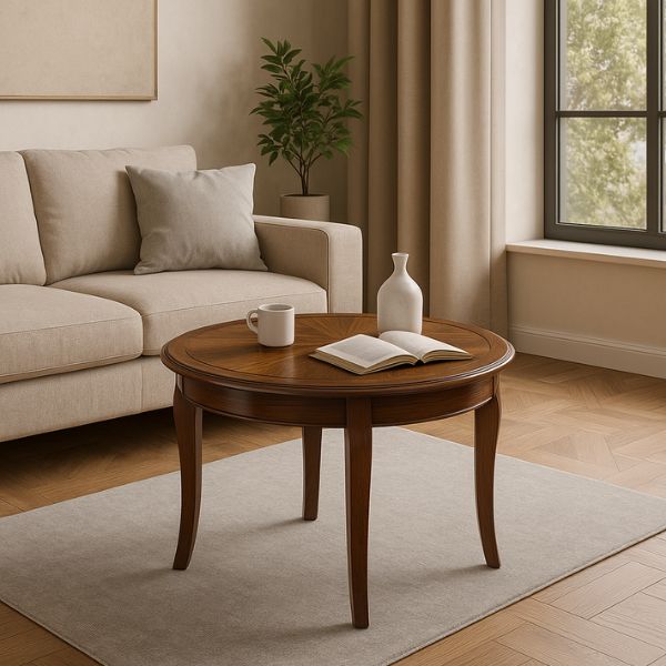 Jeho kulatá deska v ořechovém dekoru a jemně profilované nohy vytvářejí harmonický celek, který okouzlí elegancí a stylem.