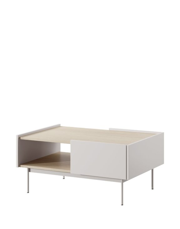 Kombinace korpusu v odstínu Kašmír s deskou v dekoru dub linea přináší do interiéru teplo a útulnost, zatímco minimalistická forma stolku se dokonale hodí do moderních obývacích pokojů.