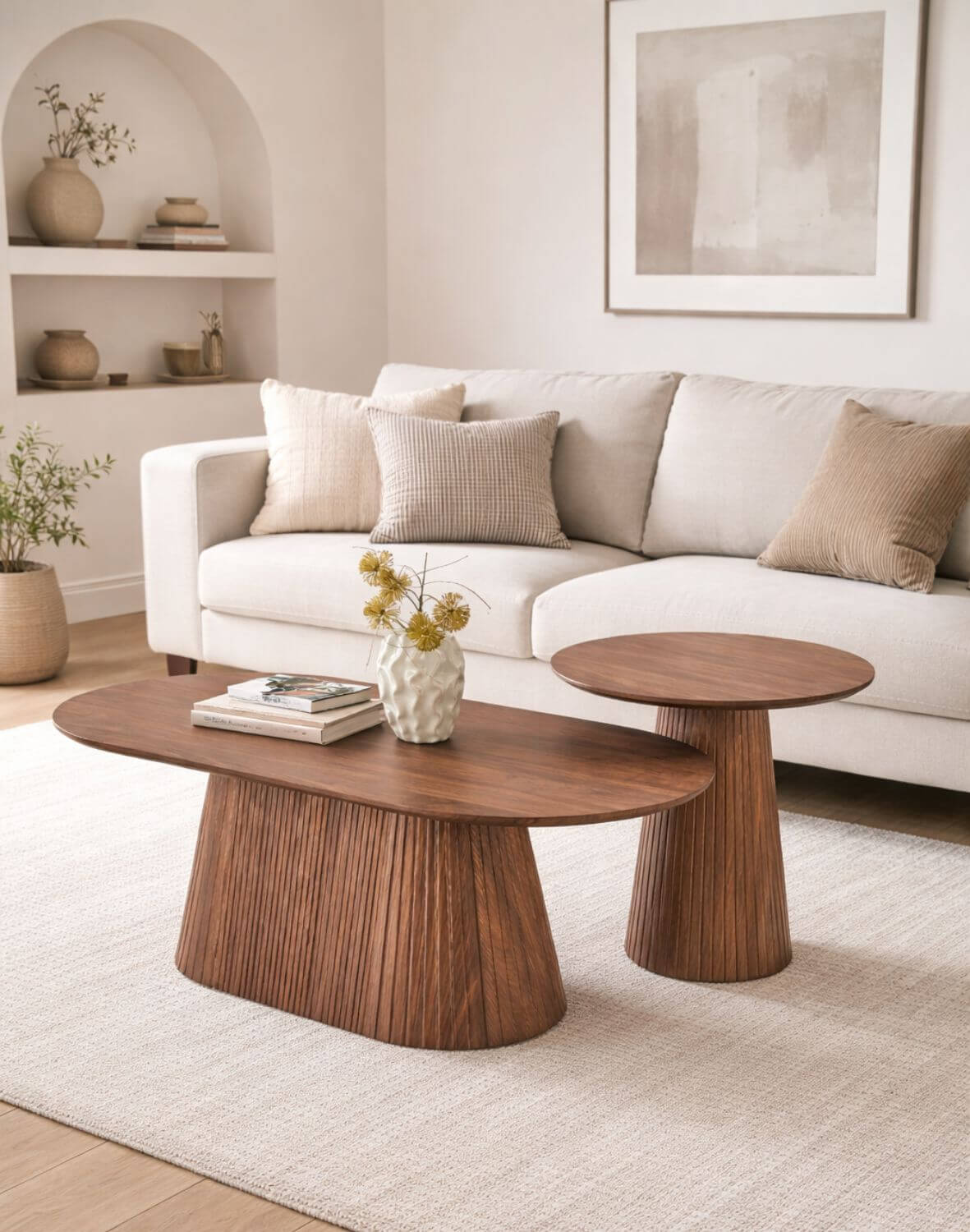 Oválná deska s jemně zaoblenými hranami dodává celku lehkost a zároveň poskytuje praktickou odkládací plochu pro každodenní použití – ideální na kávu, dekorace nebo knihy.