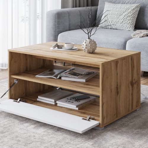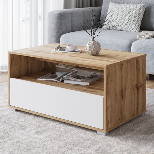 Konferenční stolek má jednoduchý, geometrický tvar v dekoru dub wotan, který je elegantně doplněn bílými čely. Vzniká tak moderní a nadčasová kombinace, ideální do obývacích pokojů zařízených v moderním, minimalistickém i industriálním stylu.