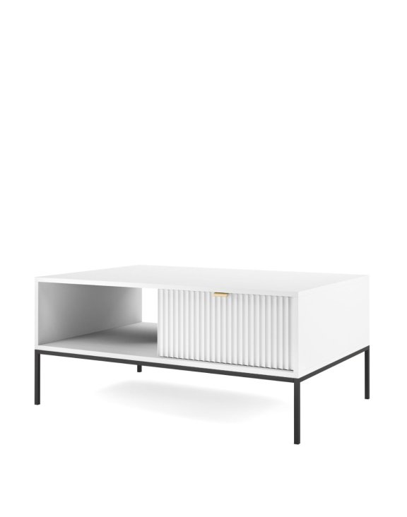 Čelo stolku je vyrobeno z drážkované MDF desky o tloušťce 18 mm, což mu dodává eleganci a styl. Hrany čela jsou zpevněny ABS hranou a hliníková úchytka mu dodává moderní vzhled. Nohy stolku jsou vyrobeny z ocelové konstrukce s práškovým lakováním, které zajišťuje jejich pevnost a stabilitu.
